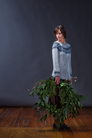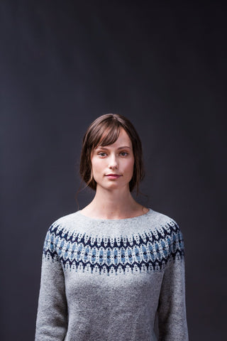 A blaze of fall color about the shoulders makes this cheerful Loft pullover a pleasure to knit and wear. Worked circularly from the bottom up with gentle waist shaping, Voe offers plenty of mellow stockinette before the fireworks of the yoke. An innovative stranding approach creates tiny dashes of woven color amid the motifs. The hem and cuffs are distinguished by a contrast-color cast-on and garter double rib, with the yoke design echoed on the sleeves. The slim, tailored fit and wide, shallow neckline give Voe a vintage, feminine feel.