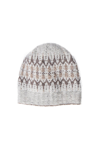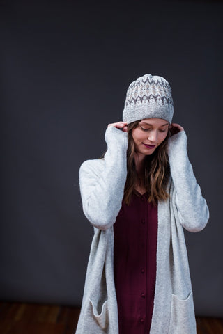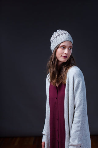 As the charming sibling of the Voe Pullover, the Voe Hat features the same colorwork motif punctuated by tiny dashes of woven color. For those smitten with the cheerful peaks and valleys of the pullover, this hat pattern provides an opportunity to hone your stranding skills before taking on a larger colorwork project, or to knit up a festive, matching set. Whatever you choose, delight in the joy of assembling a palette that reflects your unique style.