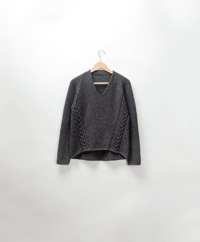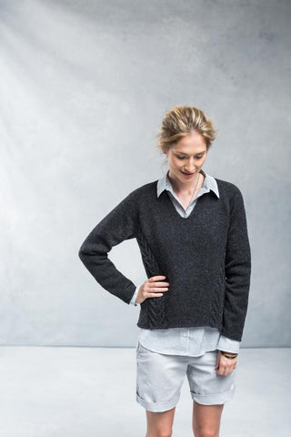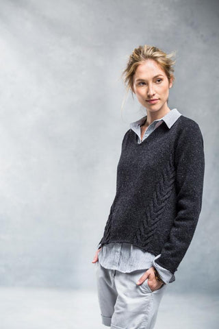 The casual comfort of a cozy raglan is elevated by unusual construction and bold cables that ascend the torso on the bias to create flattering lines. Wake is worked in pieces of irregular shape—the back with a wide hem that wraps around to the hipbones and forms a graceful curve worked with short rows, the front narrow at the waist with an incisive V-neck—and then seamed to achieve a raglan style with an asymmetric hem that’s higher in the front. The edges are left almost raw for clean, simple finishes.