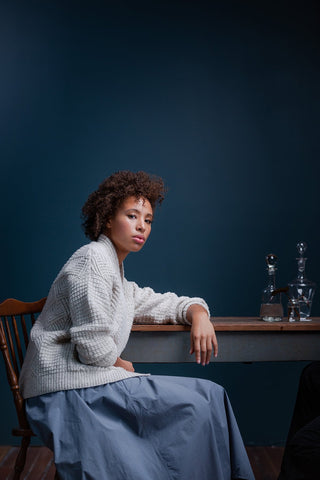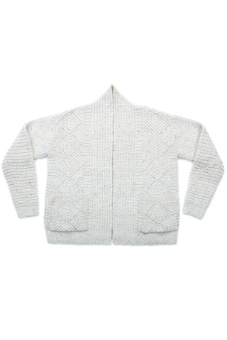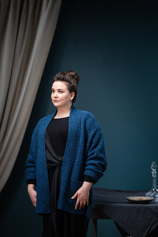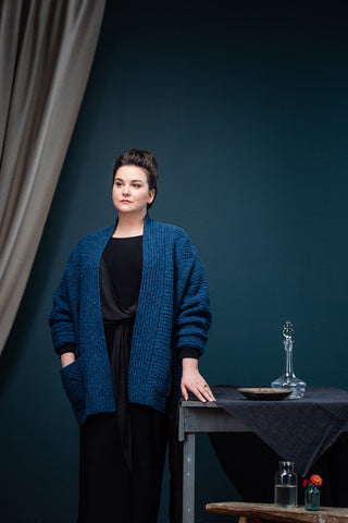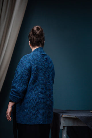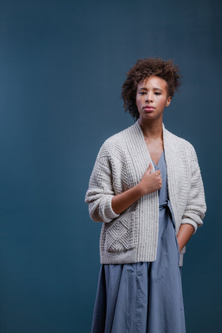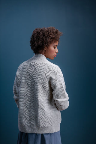 Cocoon in a fabric at once quiet and expressive. Putting humble knits and purls to good use, Watermark exhibits a harmonious meshing of easy to love (and accomplish) textures: grid stitch, furrowed ribbing, and classic one-by-one ribbing. Nestled in between each are panels of geometric cables, branching to form chevron diamonds that shine when the light hits just right. Contemporary construction details designed to flatter, like modified drop shoulders and gentle waist shaping, marry fabric, pattern, and shape all together — the patch pockets don’t hurt, either!