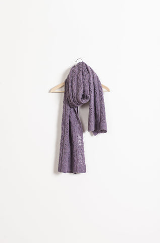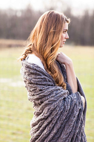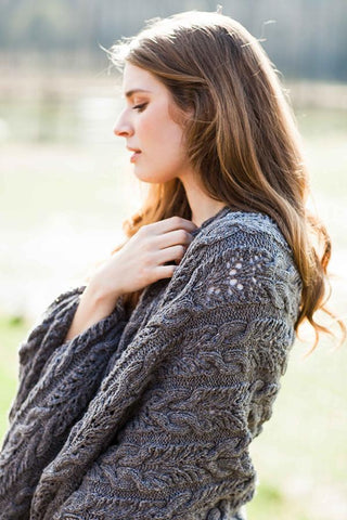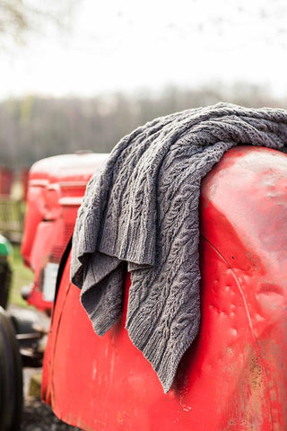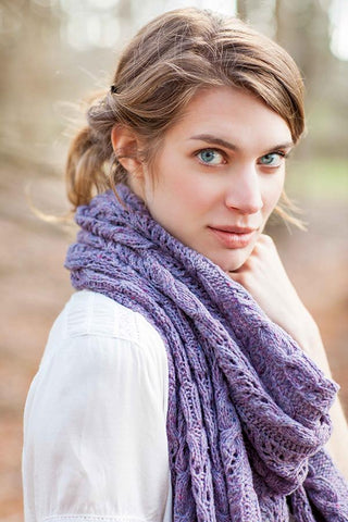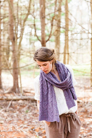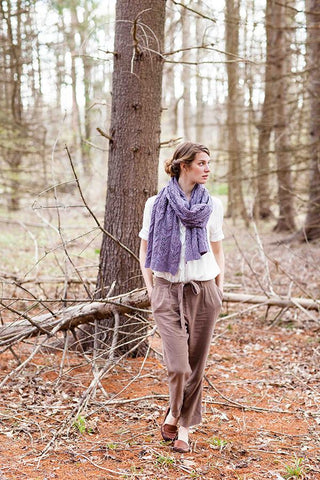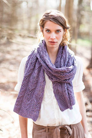 “A cozy rectangle to knit in two yarn weights (fingering or worsted) and four sizes (scarf/wrap/small throw/large throw). Twining lines in a rich brocade motif add an organic element that relieves the pattern’s formal structure and translates beautifully in both jewel tones and pale shades from nature. Ribbed hems provide a classic, neat finish to the edges.”− Anne Hanson